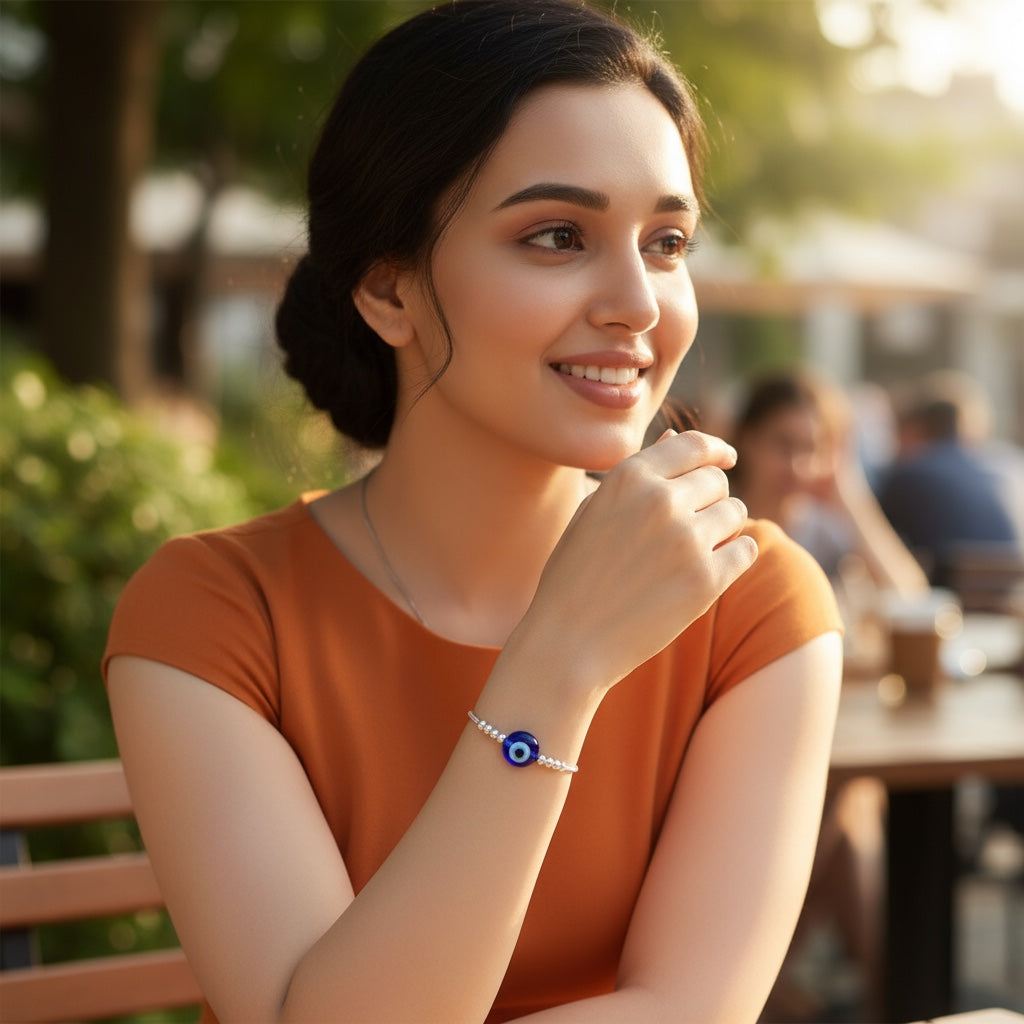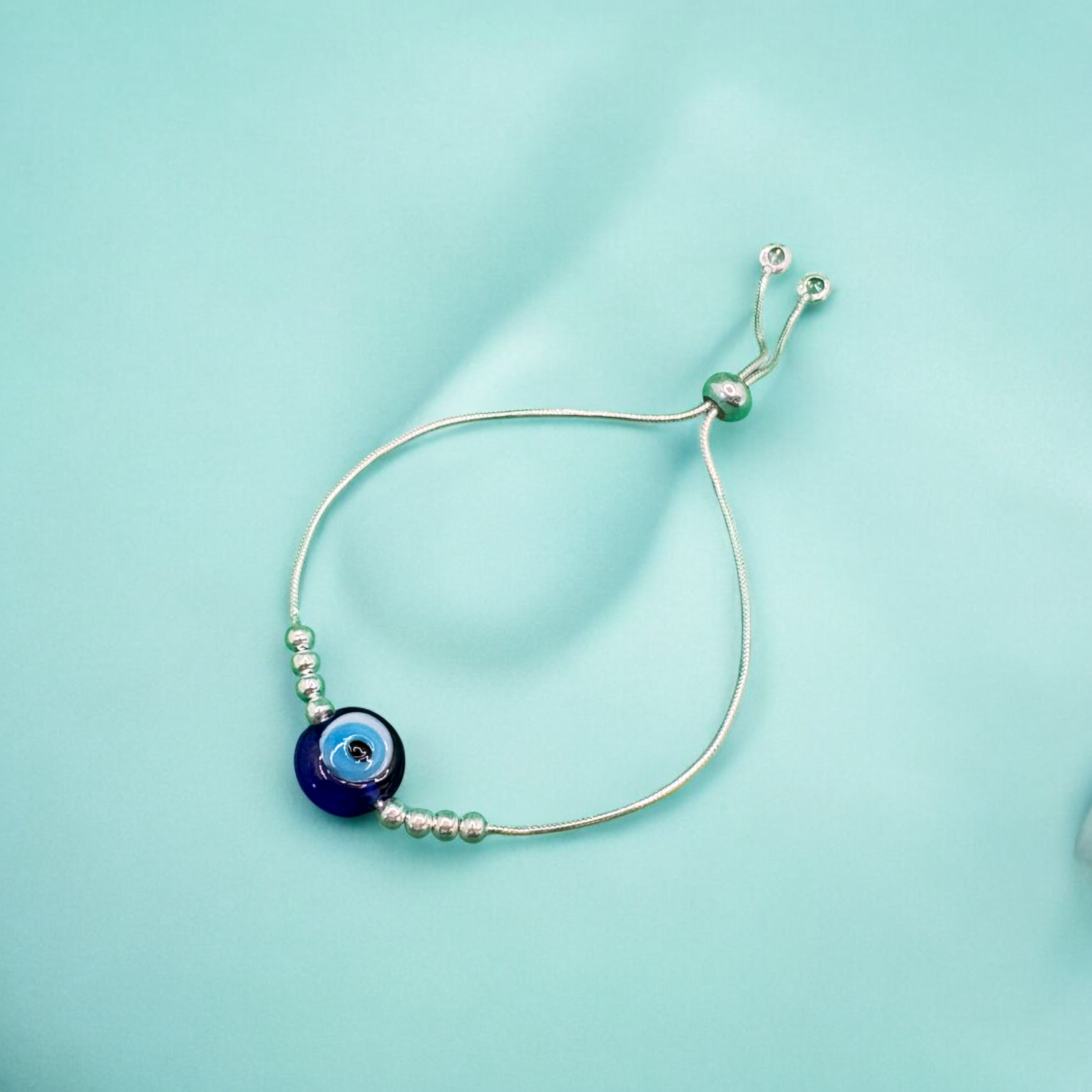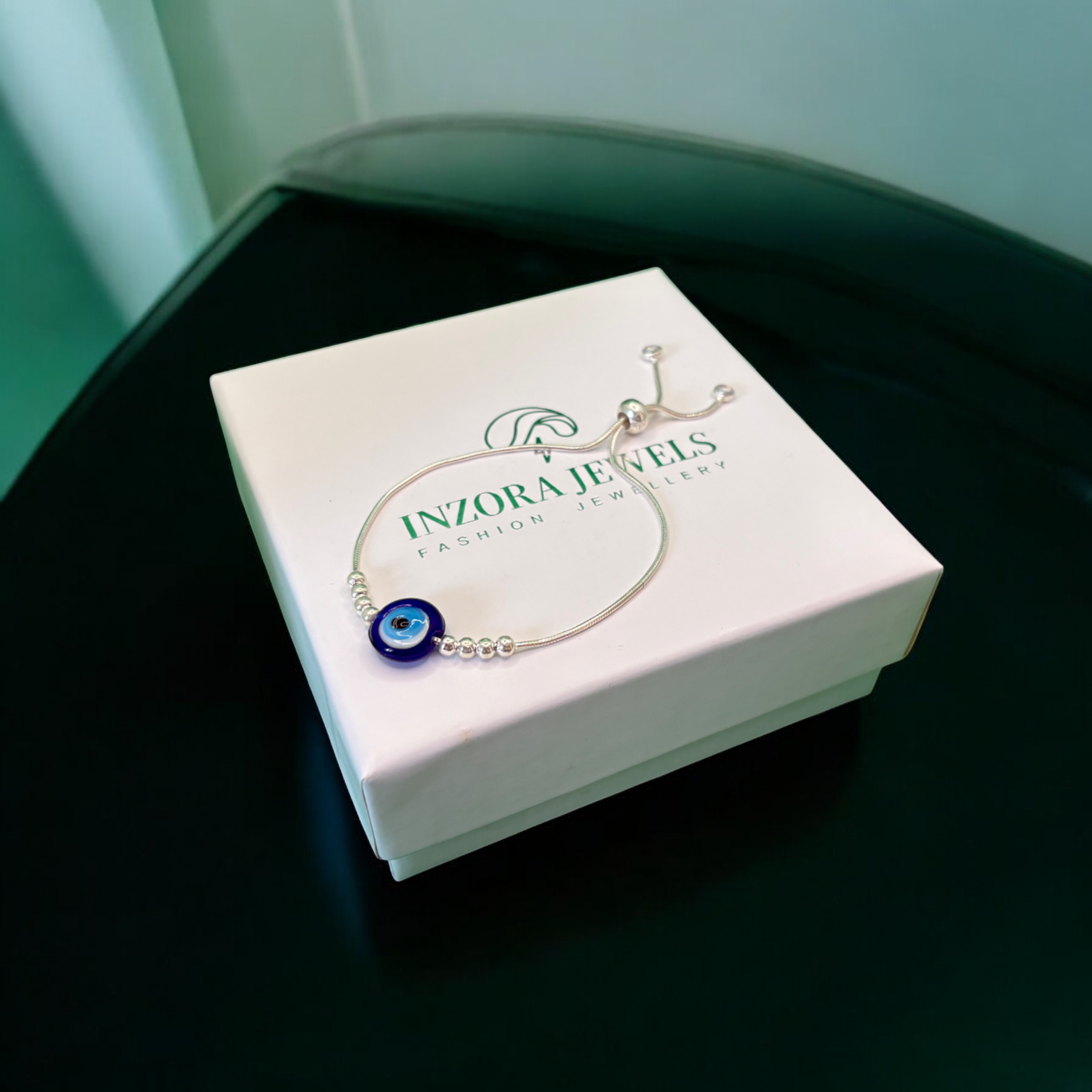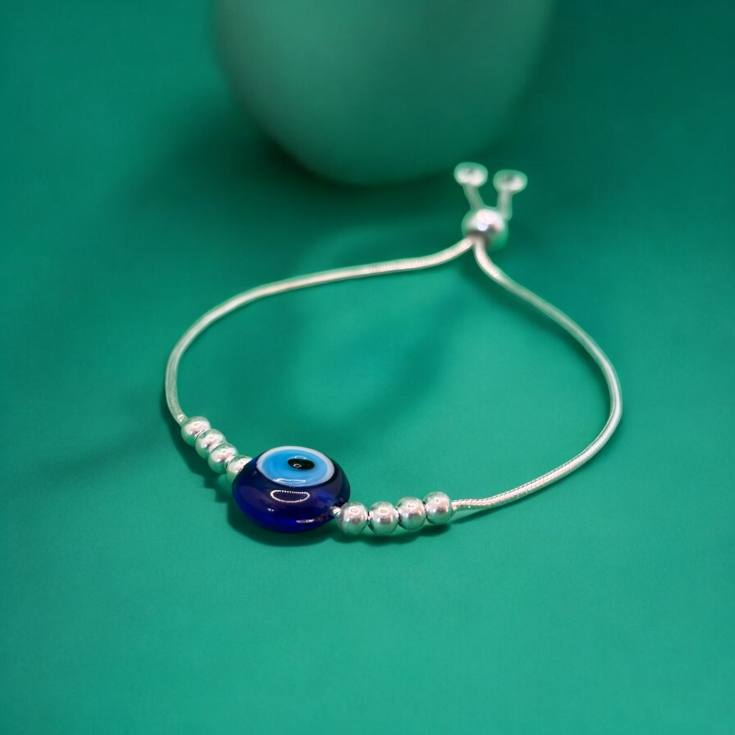 This elegant 925 silver bracelet from Inzora Jewels features a minimalist adjustable design, adorned with polished silver beads and a striking blue evil eye centerpiece. The sleek silver finish and protective evil eye motif make it perfect for everyday wear or special occasions, adding both style and a sense of positivity to any outfit.